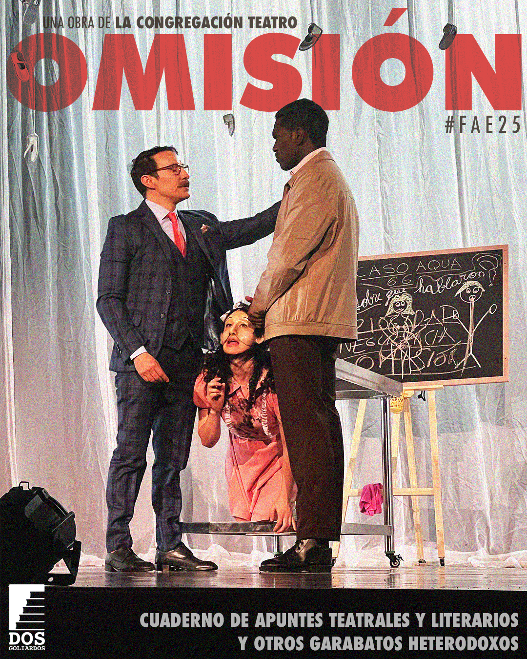 Otro dispositivo importante es el del personaje ausente-presente. Por definición, en la literatura, un personaje ausente es aquel del cual se habla, hace parte de la trama, pero nunca toma parte de la acción. “Esperando a Godot” es el ejemplo por antonomasia del uso de este tipo de personaje. En Omisión esta idea se reelabora y el personaje ausente, aunque constantemente mencionado en los parlamentos, también se encuentra presente en el escenario. Me da muchísima curiosidad saber si esta es una decisión de dirección (lo cual me inclino a considerar) o si ya desde la dramaturgia se ha planteado esta ausencia presente. La niña, como es de esperar, es una pieza fundamental de la composición. El uso de la máscara acentúa su fragilidad, ya que le confiere cierta aura de muñeca de cerámica, aunque sus movimientos son ágiles, sigue quedando en el aire esa impresión de estar contemplando algo quebradizo, a un ente que no pertenece al ámbito de la violencia. Las actividades que la niña realiza: cantar, escribir en la pizarra, sacar objetos de su mochila, golpear los zapatitos que cuelgan, jugar con el carrito, acostarse en la mesa, servir café en su juego de té, etc., son los términos que alteran el sentido del diálogo entre los otros dos personajes. No es lo mismo tomar una pausa para el café y que venga un mesero cualquiera a servirlo, a que sea la víctima de tortura, violación y asesinato quien lo sirva, y además en tazas de juguete. No es lo mismo ver a cualquier niño jugando tranquilamente con un carrito, que ver a la niña que fue secuestrada jugar con la réplica en miniatura del mismo modelo de auto en el que fue sustraída, y además en el momento justo en el que se narra ese rapto. Como es evidente, esa presencia pone en crisis la objetividad del relato policial, forense, y también interpela a los espectadores.